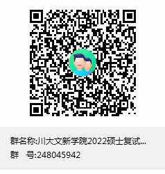 1. 请所有复试考生于2022年3月18日至3月20日内实名(以“报名号+真实姓名”为验证消息的方式)加入“川大文新学院2022硕士复试通知总群”,以便沟通交流。群号:248045942,群二维码: