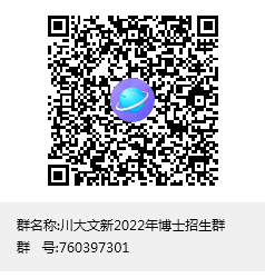 1.请所有复试考生在4月17日前实名(以“报考专业名+报考导师名+真实姓名”为验证消息的方式)加入“川大文新2022年博士招生群”,以便沟通交流。QQ群号:760397301,群二维码: