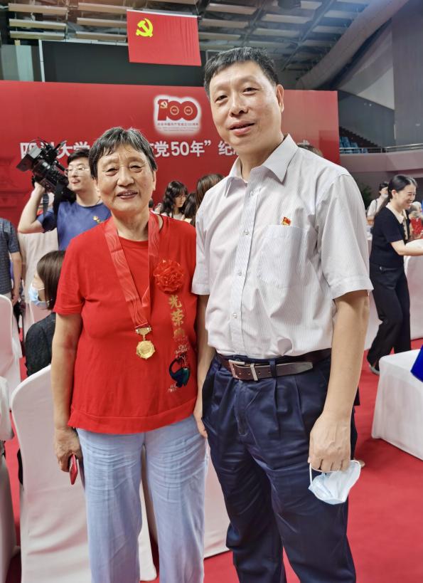 原新闻学院党总支书记曾繁铭老师动情地说:“我今天特意穿了大红的衣服,开心,喜庆。这枚奖章不仅是党中央对我们的牵挂关爱,也是党中央对我们的嘱托,时刻提醒着我始终以党员身份严于律己,发挥党员模范带头作用!”