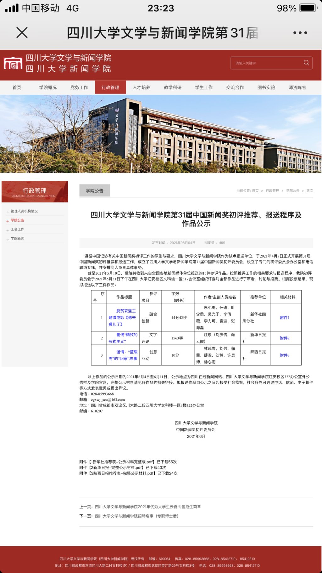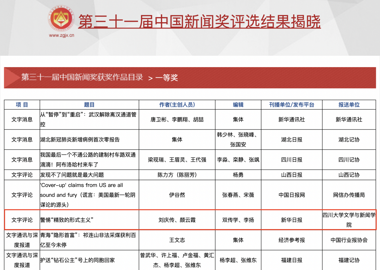 2021年11月7日,中华全国新闻工作者协会主办的第三十一届中国新闻奖评选结果揭晓,四川大学文学与新闻学院报送的新华日报作品《警惕“精致的形式主义”》喜获第三十一届中国新闻奖一等奖,是此届中国新闻奖一等奖中仅有的三篇文字评论之一。这是自2016年起担任试点报送单位以来,吃瓜网站