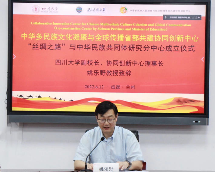 接下来,姚乐野、曹顺庆为分中心线上授牌,白日霞、郭郁烈在西北民族大学会议现场为分中心揭牌。