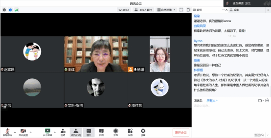 中国古代文学教研室王红教授为2022级本科新生开展主题为《无情的天地与多情的万物:杜诗的“自我拯救”》的线上讲座。学院党委书记古立峰教授、院长李怡教授、院党委副书记银浩老师作为嘉宾出席,讲座由2022级新生辅导员杨珊老师主持。