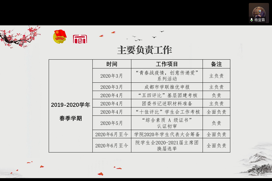 学生会主席杨宜霖汇报主要负责工作