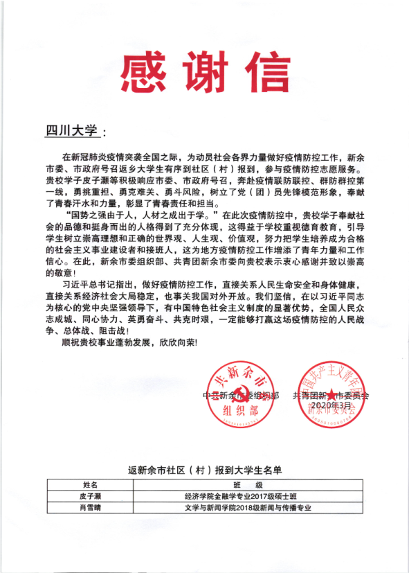 新闻与传播专业2018级硕士研究生肖雪晴,接到该市新冠肺炎防控指挥部送来的表扬证书时,显得些许腼腆。