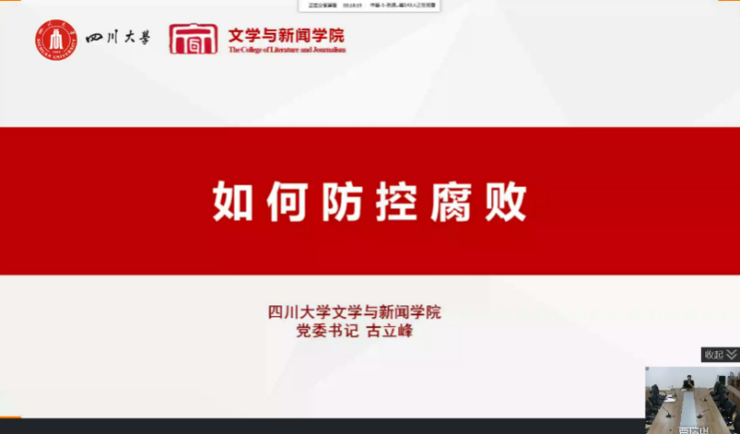 为深入推进全面从严治党和党风建设,落实开展院党委组织的“党风廉政教育宣传月”系列活动,本科2019级从爱国廉政党课和主题团日两个方面展开,充分学习党的相关会议精神,扎实推进校园廉洁文化建设。