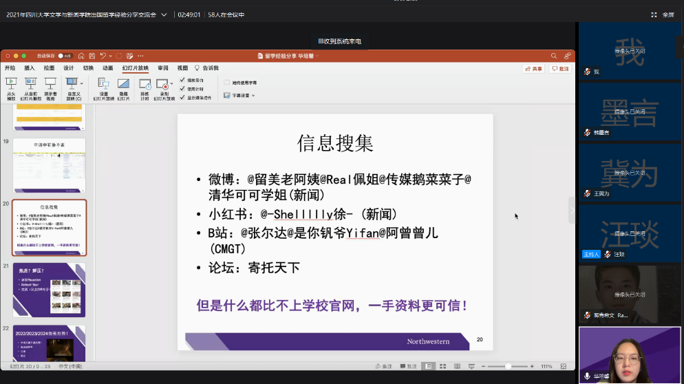 华培馨同学目前硕士就读于美国西北大学传播学专业。她基于自身经历,讲述了申请美国传媒专业研究生的经验。侧重介绍了美国新闻传播专业相关院校信息,以及申请美国院校的准备,如成绩WES认证等。同时,就如何做到留学申请中的合理解压,未来留学美国形势等问题提出了自己的建议和看法。