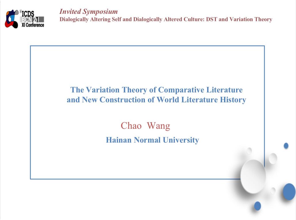 海南师范大学王超副教授的发言题目为《比较文学变异学与世界文学史的新建构》。王超副教授从比较文学变异学的角度审视世界文学史的新建构问题,认为大卫·达姆罗什(DavidDamrosch)关于世界文学重构提出了三条重要的路径——流通、翻译和生产,这与曹顺庆教授的变异理论有着内在呼应,并对这种呼应进行了详细分析。